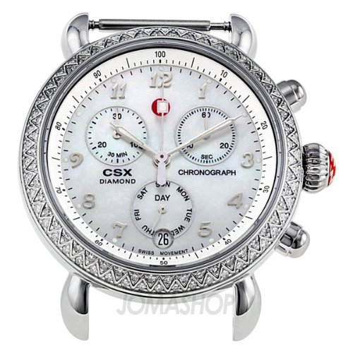 Michele CSX Chronograph Diamond Bezel Ladies Watch 03M01A1025?Stainless steel case - band is a separate purchase. Fixed silver-tone bezel set with diamonds. Mother of pearl dial with silver-tone hands and Arabic numeral hour markers. Minute markers around the outer rim. Dial Type: Analog. Date display at the 6 o'clock position. Quartz movement. Scratch resistant sapphire crystal. Solid case back. Case diameter: 36 mm. Round case shape. Water resistant at 50 meters / 165 feet. Functions: date, day, second time zone, hour, minute, second. Watch label: Swiss Made. Michele CSX Chronograph Diamond Bezel Ladies Watch 03M01A1025.