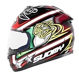 Suomy Excel Biaggi Pirate Replica Helmet (X-Large)The new composite material is a combination of carbon in various grammages and aramidic fiber. Internal polystyrene protective liner - the special shape and construction featuring differentiated density increases mechanical resistance in the event of accidental shocks. The face shield is pressed and cut from a flat sheet and then thermoformed. Each face shield is a one-of-a-kind piece with unequalled optical features and mechanical resistance. Moreover, thanks to this process, there is no need to apply overlapping lenses inside the face shield since it is equipped with permanent anti-fog and anti-scratch treatments. The D-RING retention system is designed and patented by Suomy. This reliable and tested double D ring system ensures stability, safety and resistance. Removable and washable cheek pads. For maximum safety Excel must fit tightly and be correctly and securely fastened, so it cannot be taken off neither by pulling it nor by rotating it around the head. If it is too big it may slide down over the eyes or turn in a lateral direction due to movement during riding, thus blocking visibility. Circumference: 61/62. Hat size: 7-1/2 inches - 7-5/8 inches.